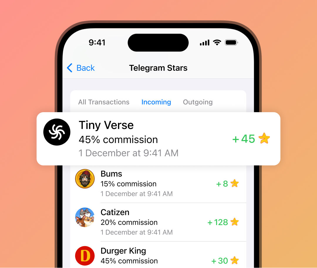 As comissões aparecerão em seu saldo em tempo real assim que um usuário que você indicou para um miniapp fizer uma transação lá. A plataforma de afiliados é uma maneira simples e confiável de ganhar Estrelas do Telegram — que você pode usar para comprar produtos ou assinaturas em aplicativos, enviar presentes para amigos, desbloquear mídias em canais e mais.