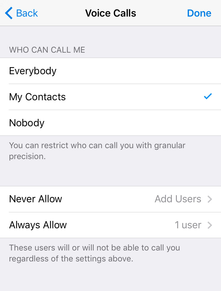 If you’re like us, you don’t like to be bothered. On Telegram, you can control who can and who can't call you with granular precision. You can even switch voice calls off altogether, blocking anyone and everyone from calling you.