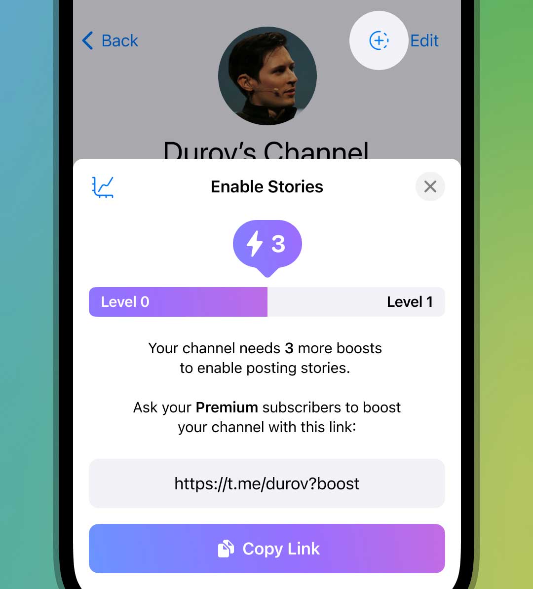 Pengguna Telegram boleh memberi saluran kegemaran mereka kebolehan untuk pos stori dengan memberi mereka tingkat (boost). Telegram Premium kini mempunyai 4 tingkat yang boleh diagih ke mana-mana saluran.