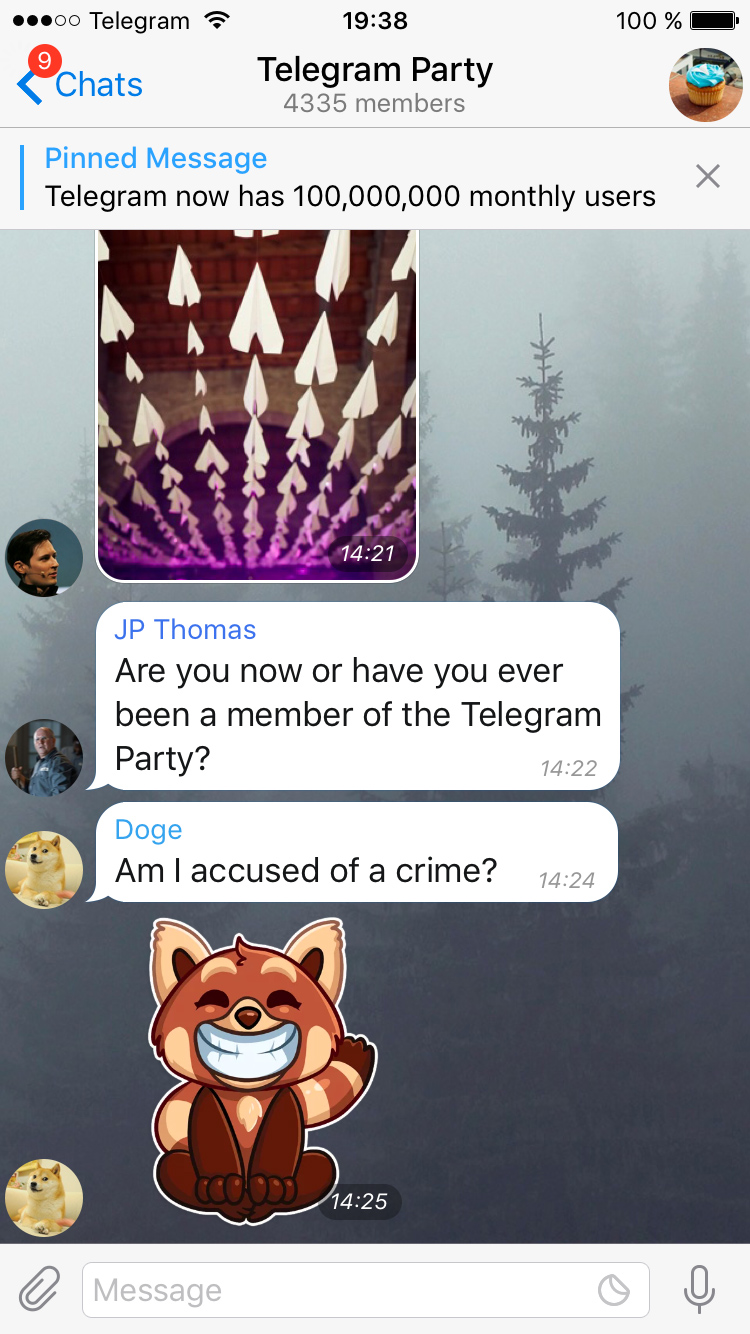 Supergroup admins can now inform all members about important news using pinned messages. Pinned messages are displayed at the top of the chat screen. All members will get a notification — even if they muted ordinary messages from the group.
